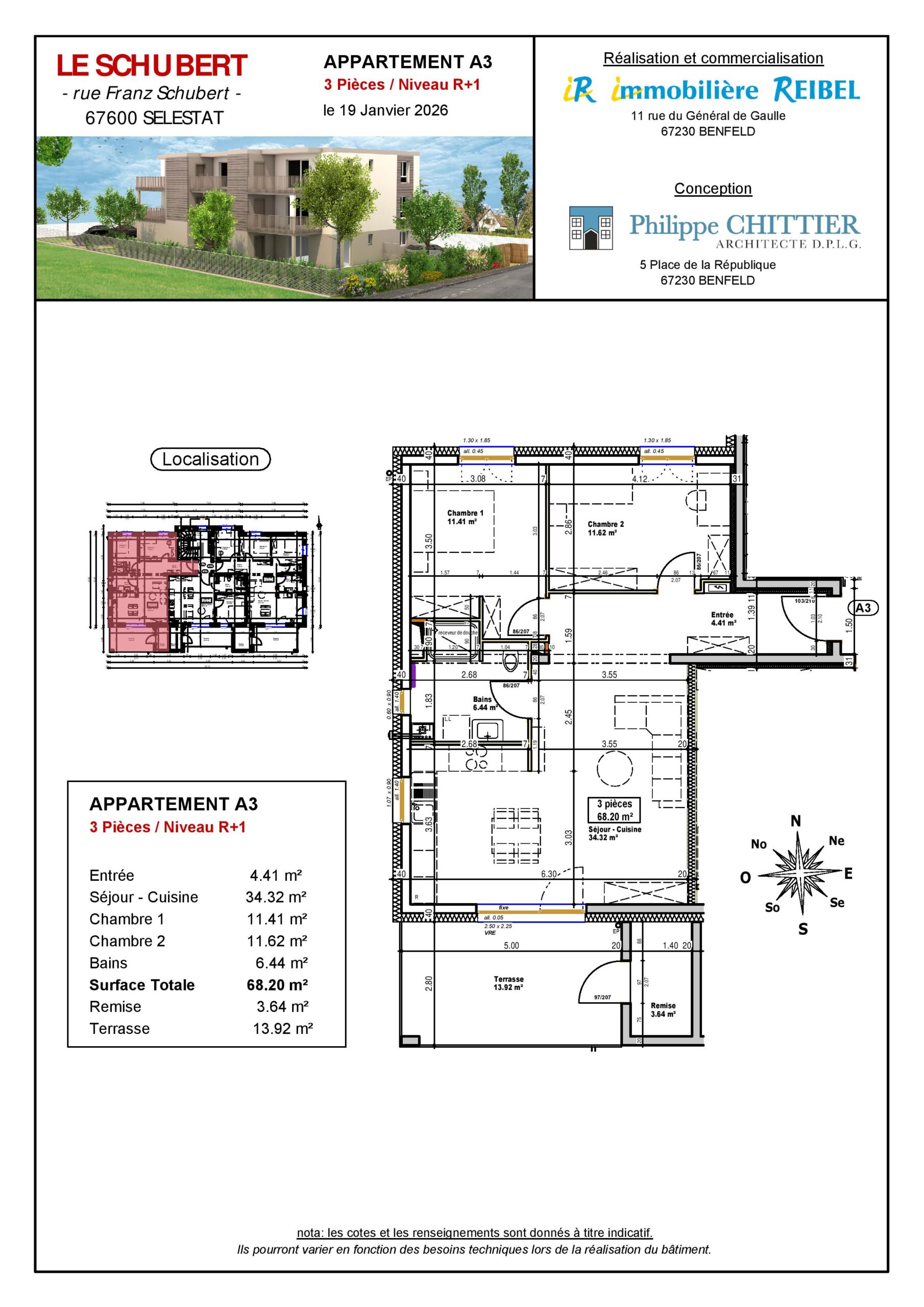 SH: 68,30 m² – Terrasse : 13,90 m² – Remise : 3,60 m²